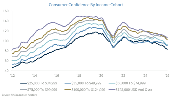 In fact, while lower‑income households have seen their confidence deteriorate more sharply than upper‑income households, sentiment is weakening across the board. Confidence levels are now approaching, or in some cases falling below, the lows reached during the COVID-19 crisis. Coupled with the January Challenger Report, which showed the highest January layoff count since the Great Financial Crisis, the data signals a labor market that has weakened considerably. Households at all income levels are feeling the strain.