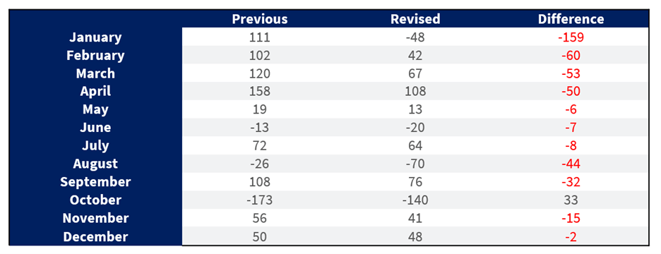 There is a lot to unpack from what was included in the delayed January employment report. The most important information was that it was very strong, up 130,000. Recent research has shown that the breakeven monthly employment growth necessary to keep the rate of unemployment stable is between 30,000 and 70,000 jobs per month. Thus, the January number was very strong according to this research. But the benchmark revision of employment in 2025 showed that the originally published 111,000 increase in jobs in January of 2025 was revised down by 159,000, and now January of 2025 stands at a loss of 48,000 jobs. In fact, the revision in January of 2025 was the largest monthly revision for the whole of 2025, as the table below shows.