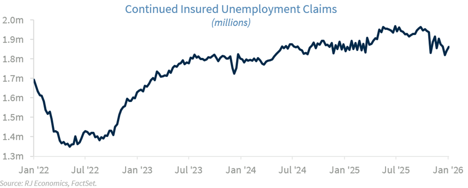 Furthermore, the continued claims series remained on a downward trend at the end of January 2026 (see graph below), showing no signs of a deteriorating labor environment. Typically, continued claims start moving higher ahead of initial claims as the ability of those laid-off workers to find a new job deteriorates. However, there are no signs of that happening today.